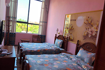 二、配置:1)本酒店拥有三层小楼(无电梯)。酒店的每个房间都有窗户,通风良好、视野开阔、光线充足。2)客房为酒店式标准双人间(每间22平方米左右)。每个房间均配有:海尔空调、43寸海尔液晶电视、、电话、电热水壶等。3)每个房间都有独立的卫生间、海尔热水淋浴、坐便马桶。